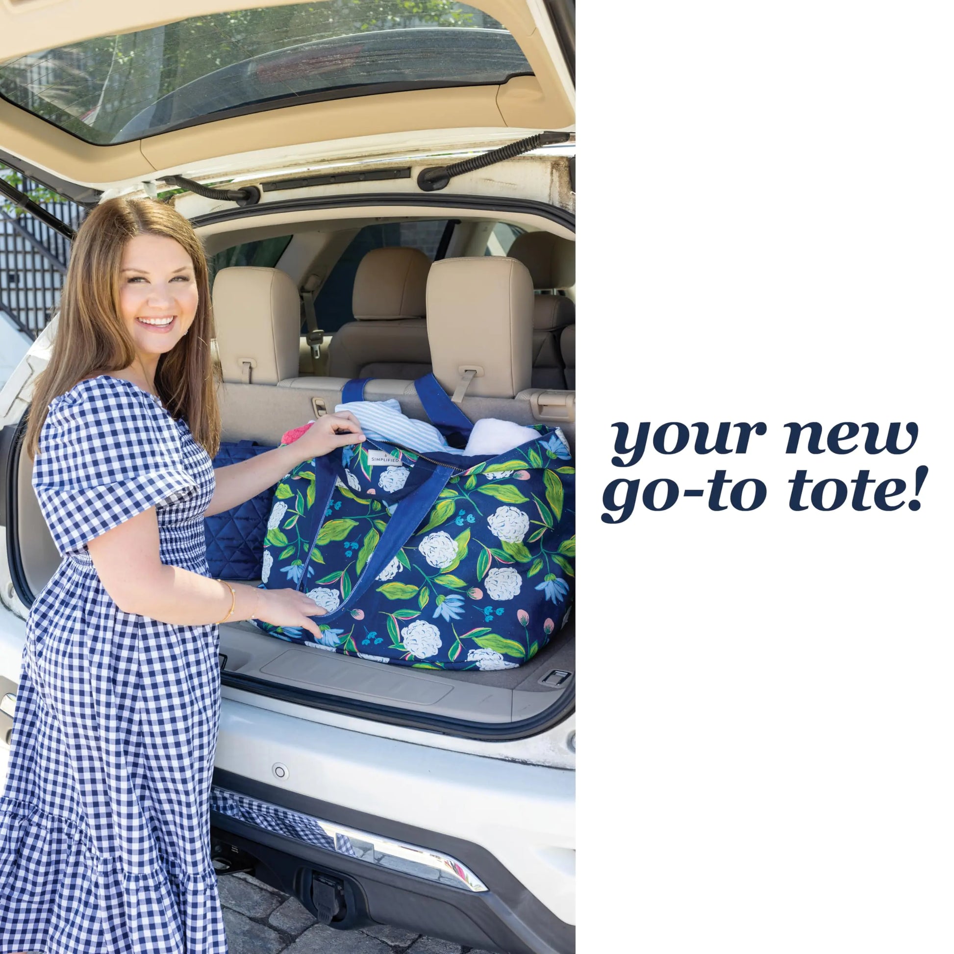Introducing the Fit + Fresh All the Things Tote Bag, the ultimate solution for all your carrying needs. Measuring a generous 22" x 18" x 12", this large tote is designed for every occasion—whether you're traveling, heading to the beach, or embarking on daily adventures. It’s the only tote you’ll need to fit “all the things.” This versatile bag features a wide zipper top opening for easy access to a spacious interior, with three large elastic pockets and one interior zipper pocket to keep everything organized. Two sets of sturdy canvas handles make it perfect as a nurse bag, diaper bag, or teacher tote. Ideal as a travel bag for women, it’s a fantastic choice for weekend getaways or as a carry-on bag for flights. Accommodating up to 50lbs and folding flat for compact storage, it's your durable weekender bag large enough to handle it all. Made from water-resistant canvas cotton, the beach bag variant is perfect for carrying beach towels, kids' toys, and other essentials while easily slinging over your shoulder. Designed by women for women, this stylish extra- large tote makes a thoughtful gift for moms, sisters, friends, and coworkers. Fit & Fresh combines fashion with functionality in every bag, proudly crafted in Providence, RI.