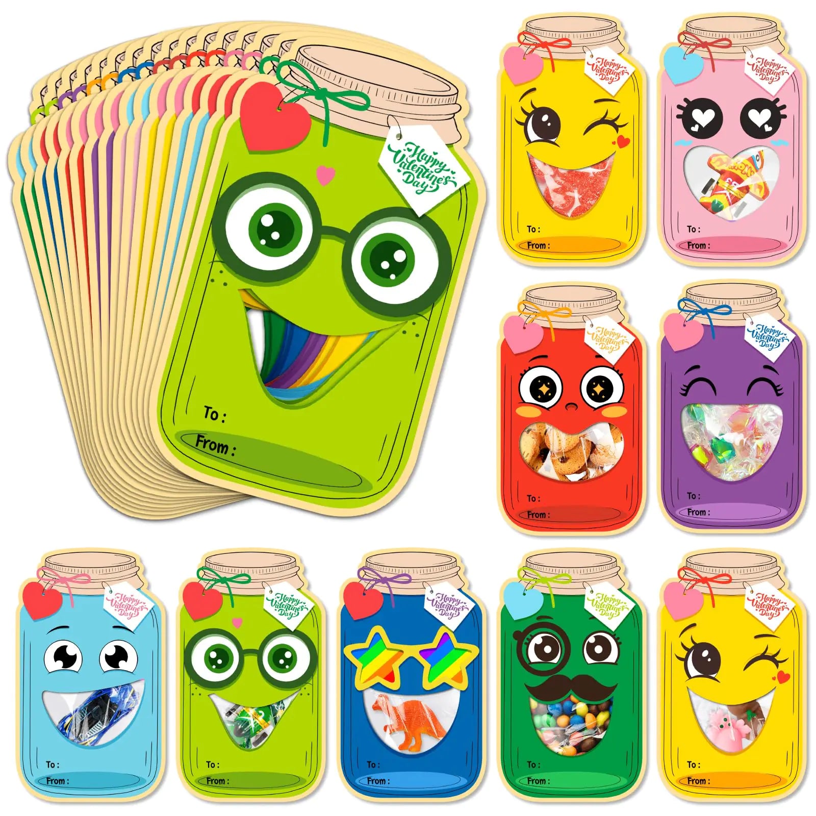 ["Super Value Candy Jar Valentines Day Card for Kids: This Valentines Day super values set included 56 Valentines Day mason candy jar cards and 56 transparent sealed Stand-up bags. Just sign up “To” and From” Packaging your own candy or other small gifts and stick it on the back of the cards." "Unique Design Valentines Cards for Kids: It is designed with Valentines Day elements that are very suitable for Valentines Day party decorations. These Valentine mason candy jar cards have cute and naughty expressions and various Valentines Day words. The cut-out heart shape of the card can display your gift very well which is very suitable for children to exchange." "DIY Your Valentines Cards: Our Valentines Day cards will enable you to invite your children or students to participate in your DIY projects allowing you to hone your manual skills and enjoy the process; Write classmate names and make with creativity. Personalized gifts will please everyone around you and enjoy it!" "Wide Applications: Valentine paper jar cards are perfect for school and home use or as a gift to children students friends and family. Its the best choice for Valentines gift for kids class activities gift exchanges school class prizes classroom rewards and many other occasions." "Premium Quality and Service: You can also check our shop for more commodities we have different items for Valentines Day gifts. If you have any questions. Please feel free to contact us. We will reply to you within 48 hours. Happy Valentines Day!"]